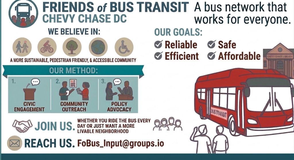 Are you passionate about making public transit in Chevy Chase more accessible, reliable, safer, and sustainable? FoBus is a community-driven group advocating for a bus network that truly works for everyone. From daily commuters to occasional riders, we believe efficient bus service reduces congestion and creates a more inclusive and community-oriented neighborhood. Whether you can help plan events, provide on-site support, or simply want to stay informed on WMATA’s Better Bus developments, your voice matters.